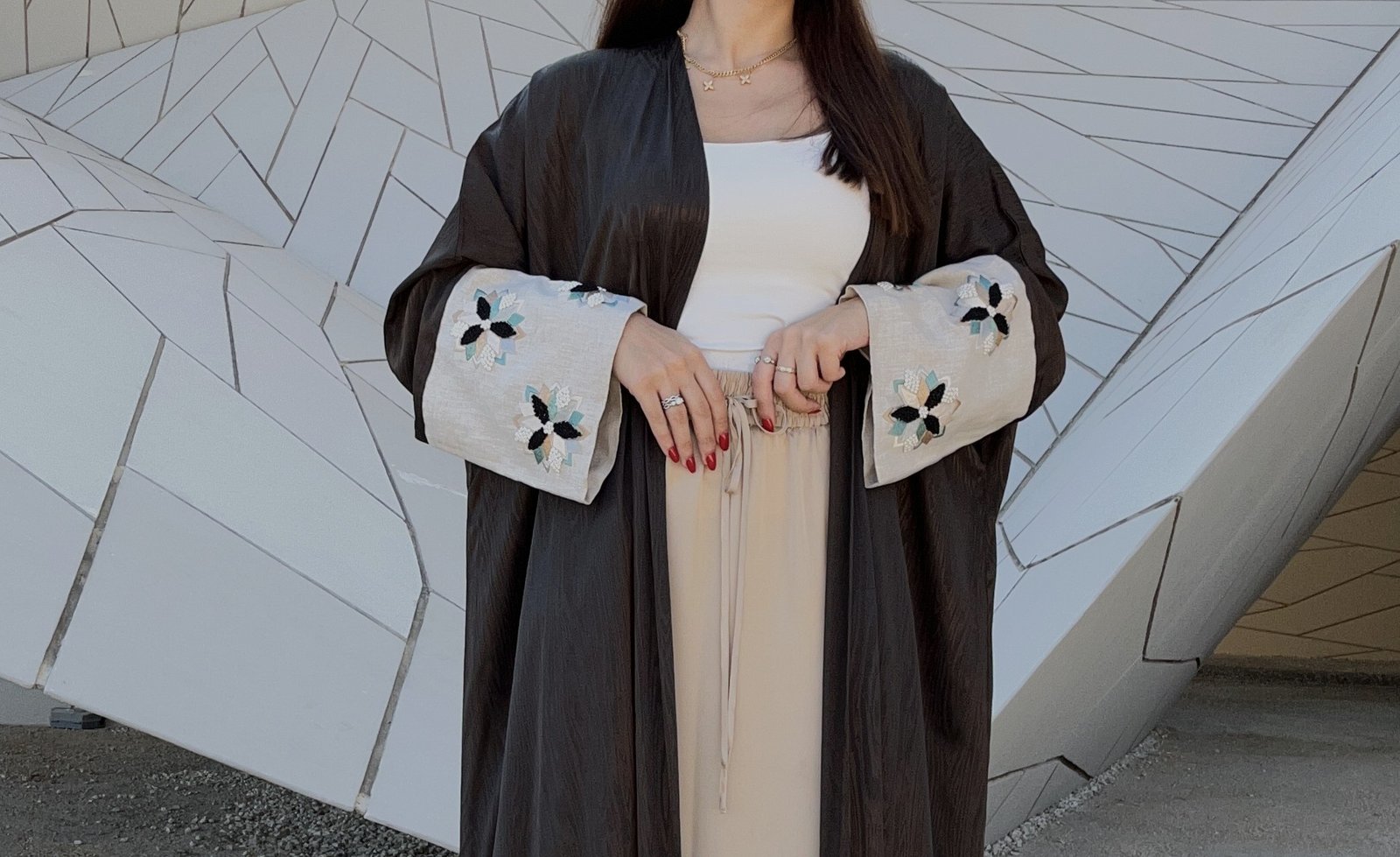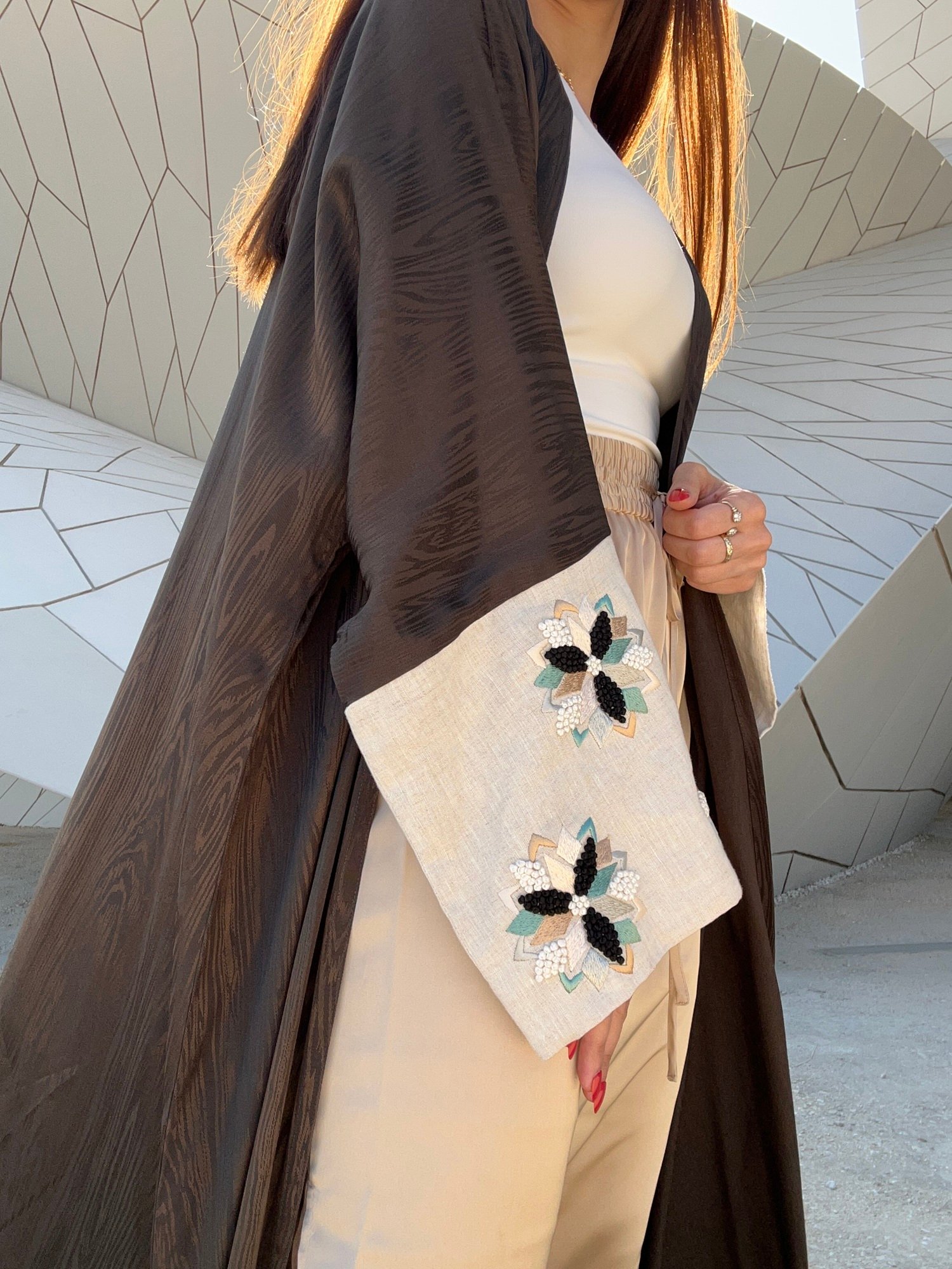 This army green abaya features a beige accent running from below the elbow to the wrist, creating a refined contrast. The lower arms are adorned with delicate, handwoven floral patterns in soft hues, adding an elegant touch of artistry. The blend of earthy tones and intricate embroidery creates a graceful, sophisticated design.