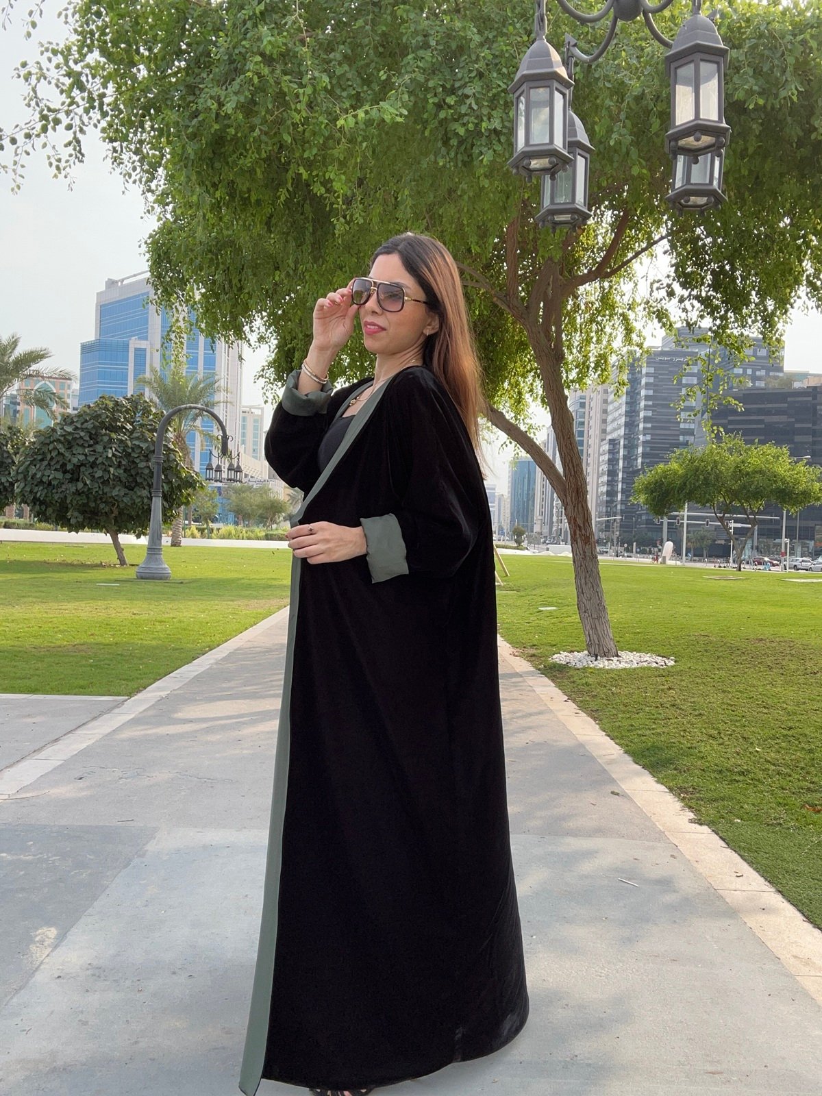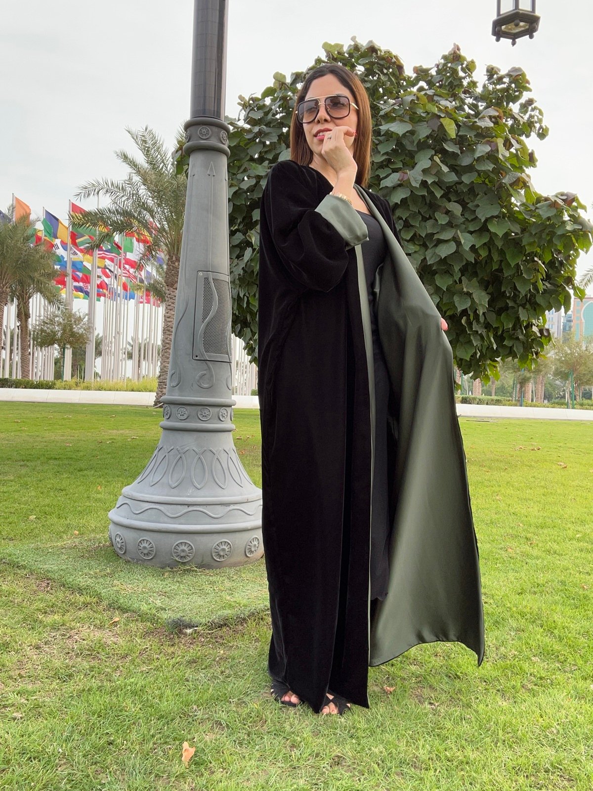 The luxurious Two Faced velvet abaya features a stunning two-tone design with a rich exterior. The vibrant green interior can be revealed by showing sections like the center panel or arms, adding an unexpected pop of color, while allowing you to keep your look classic or highlight the bold green accent.