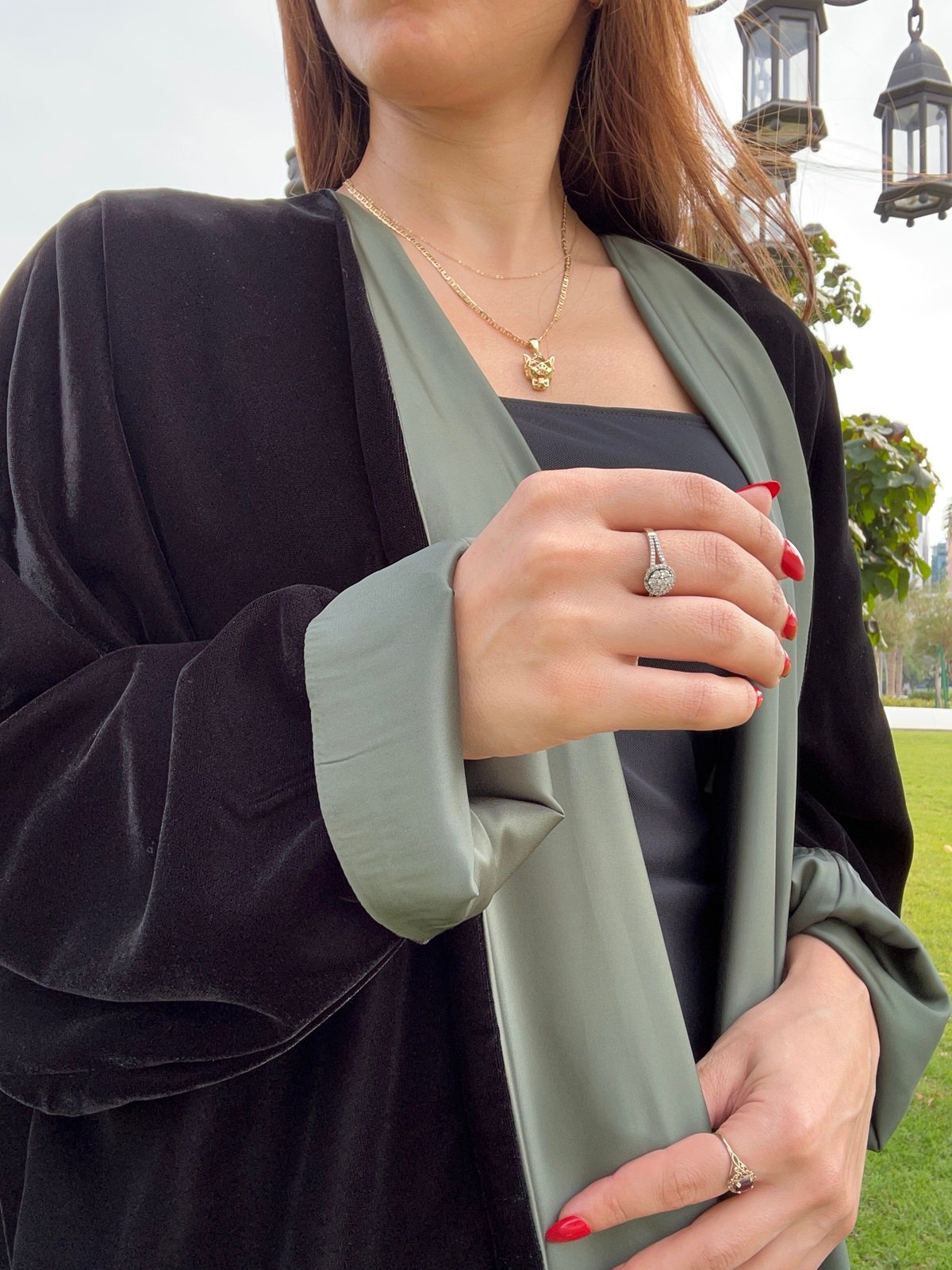 Midnight Emerald is a bisht double faced velvet abaya featuring a rich dark exterior with a vibrant green interior for a bold yet elegant contrast.