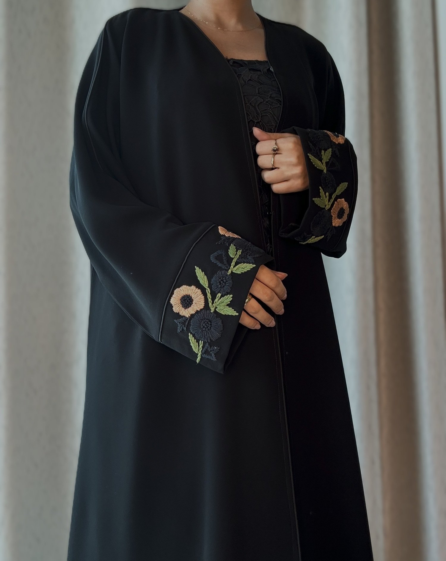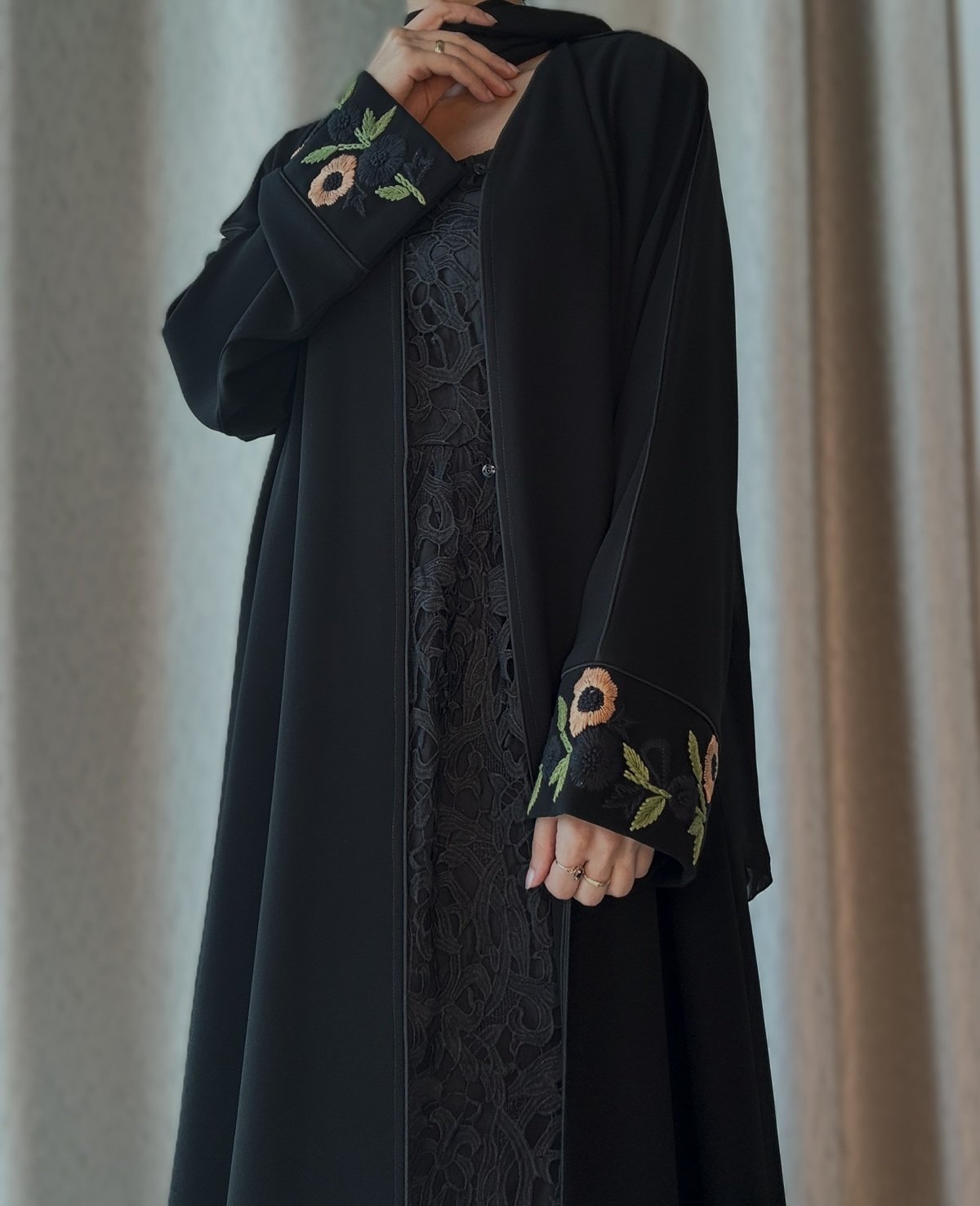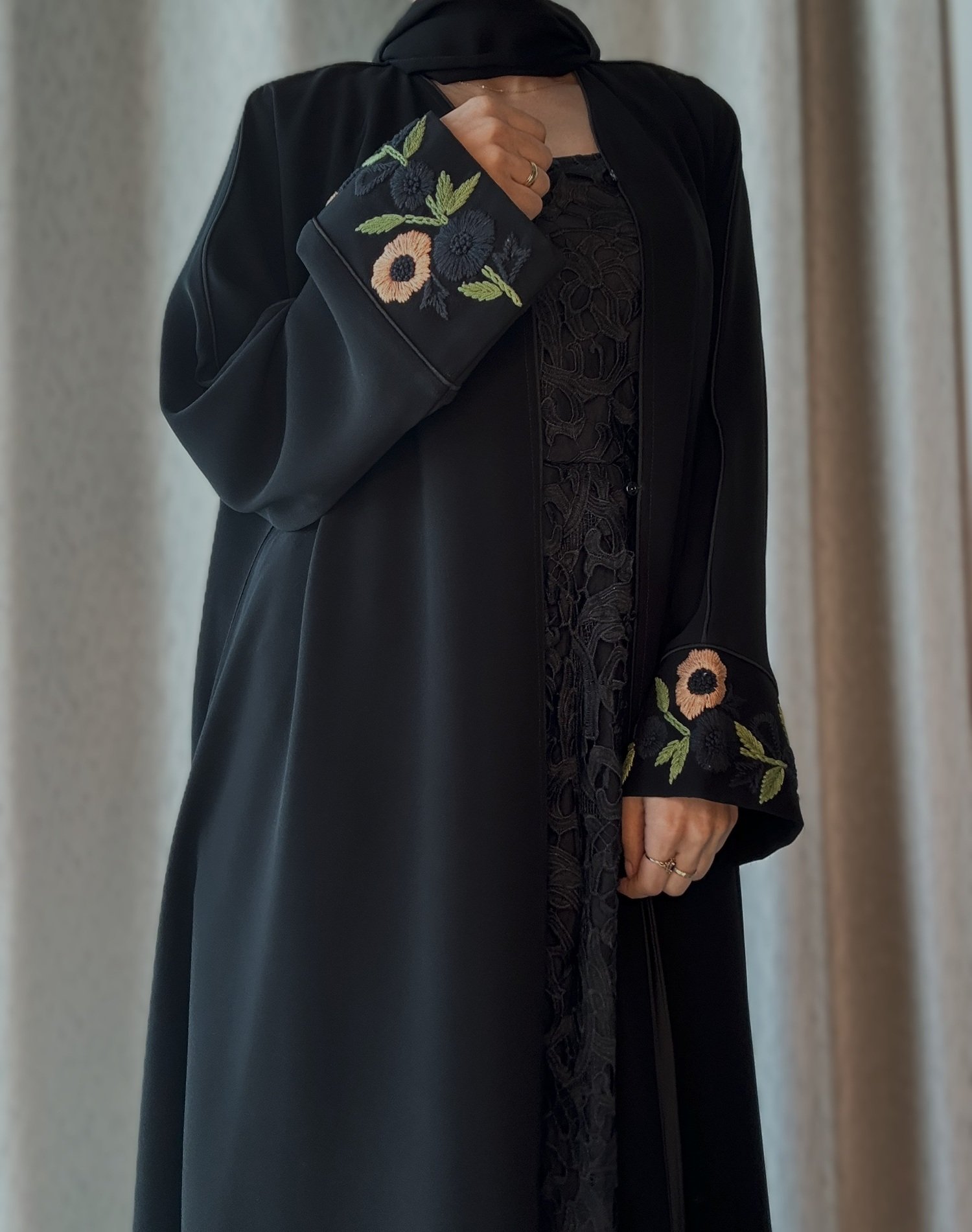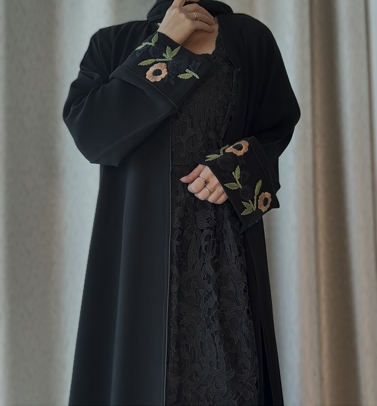 Blooming Harmony is a classic abaya crafted from premium crepe, featuring delicate handwoven floral accents at the center front for refined elegance.