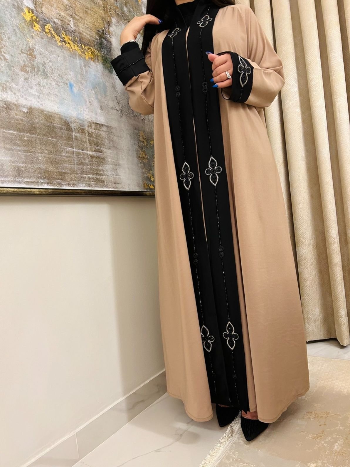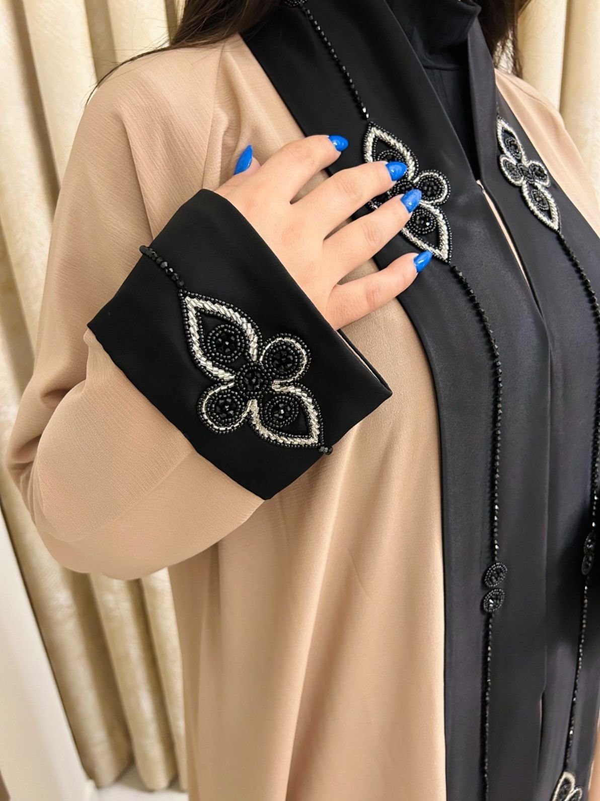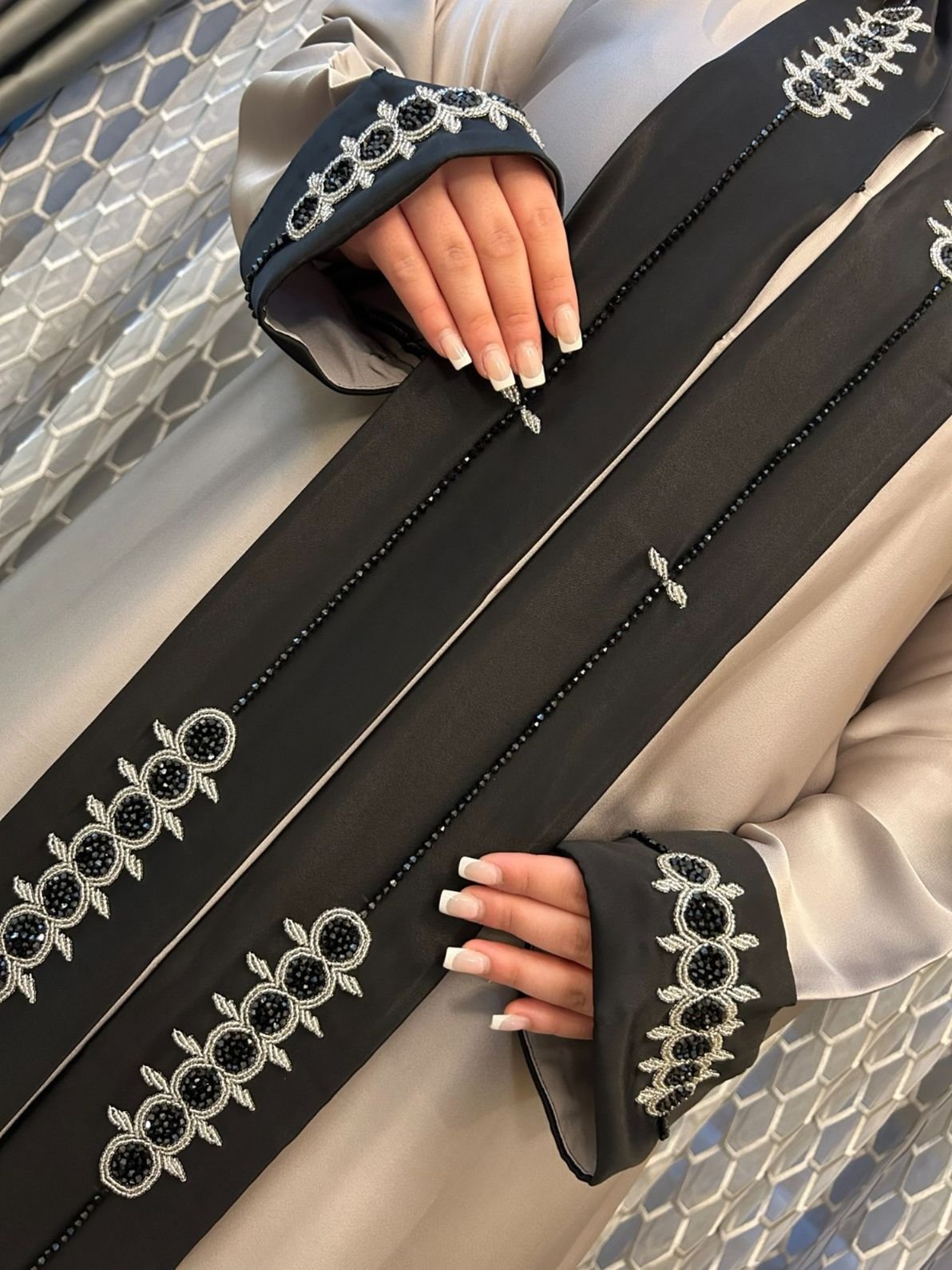 Perfect Symmetry is a classic abaya crafted from premium Korean Nida, featuring delicate hand embroidery with subtle beaded details for refined elegance.