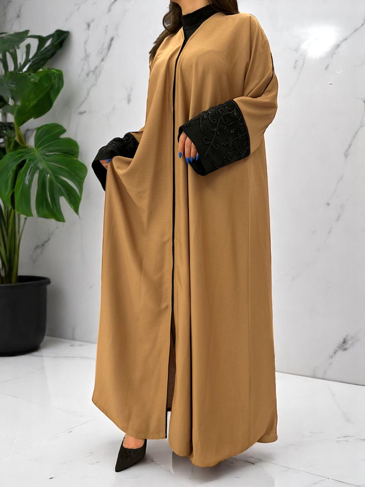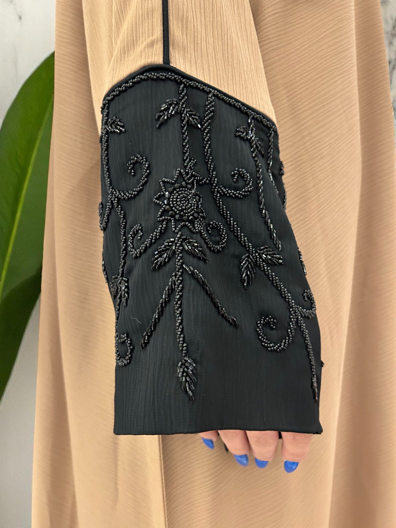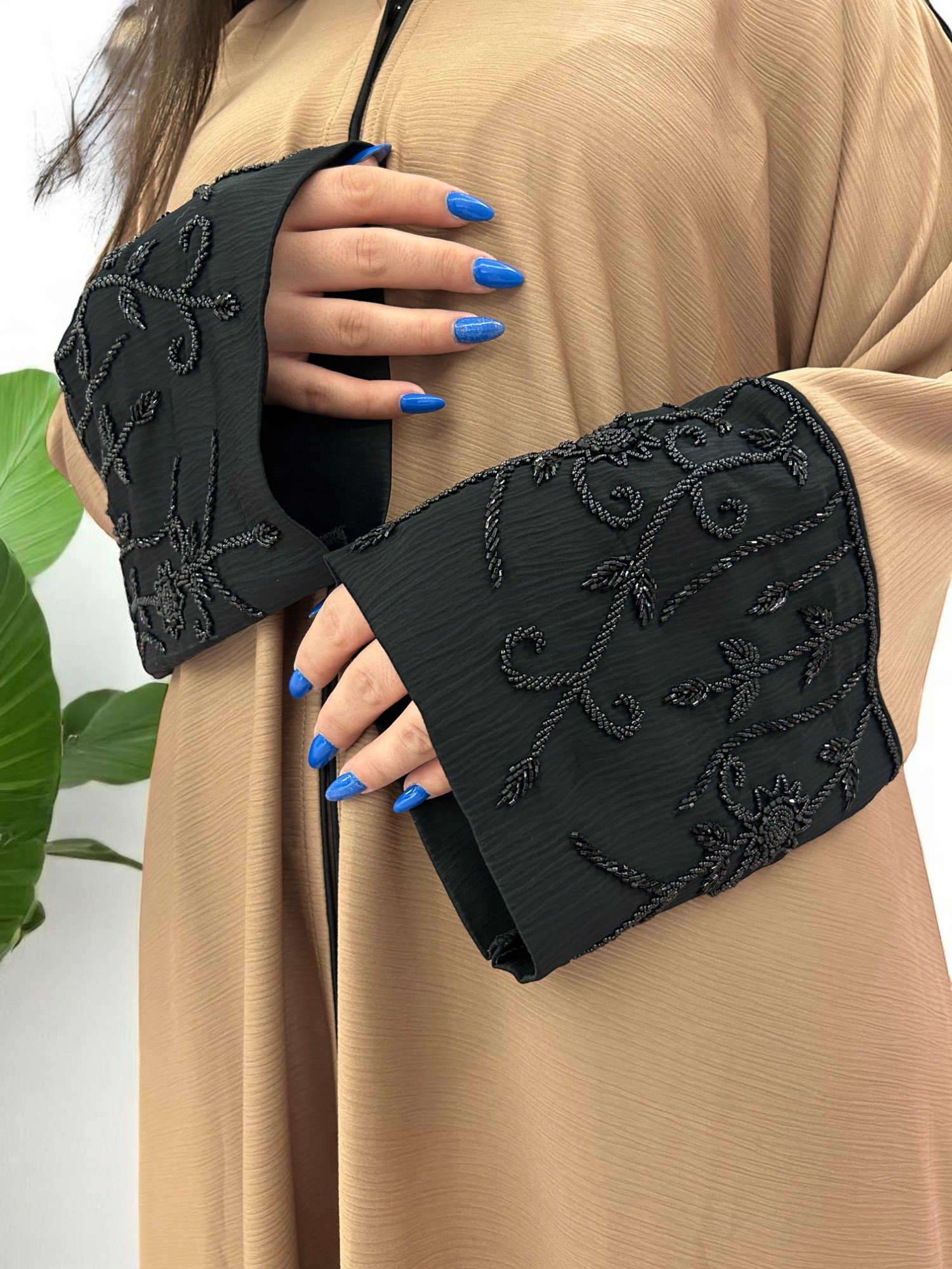 Classic Abaya with embroidery Serenity is crafted from Bali fabric, featuring a beige base with black embroidered sleeves and elegant beadwork detailing.
