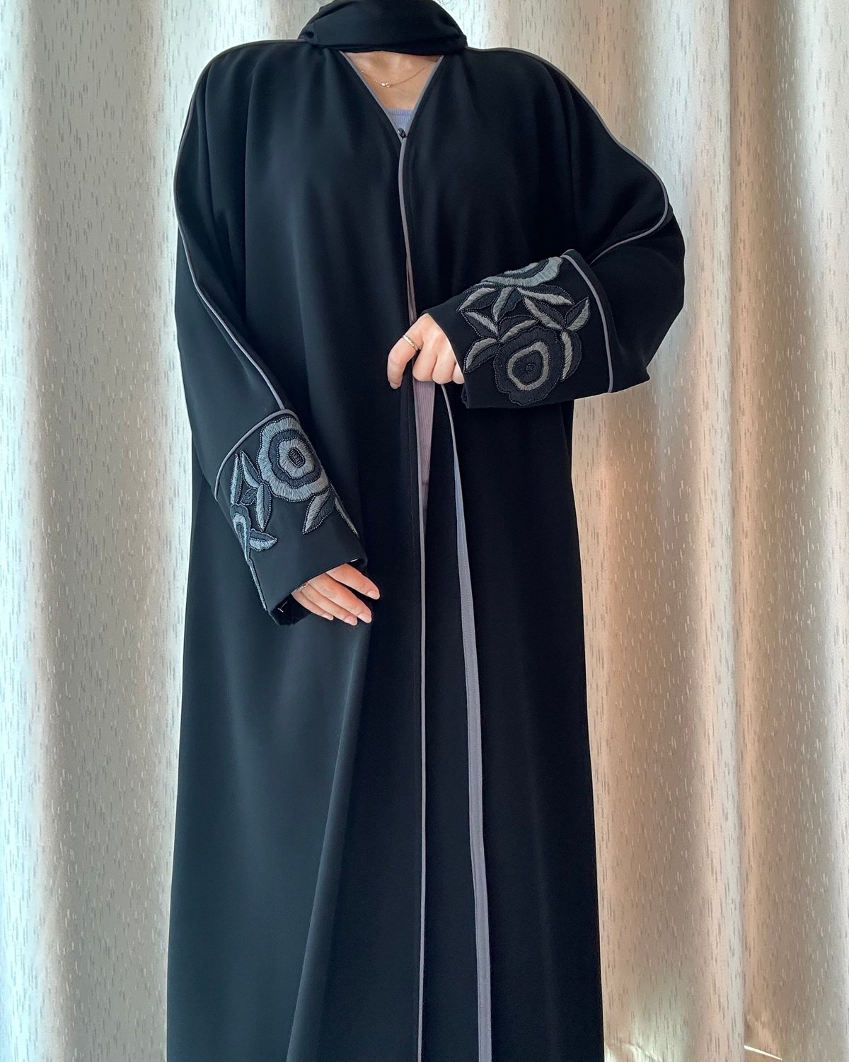 Timeless Bloom is a Black classic abaya crafted from premium crepe, featuring hand-stitched grey floral embroidery on the sleeves for refined elegance.