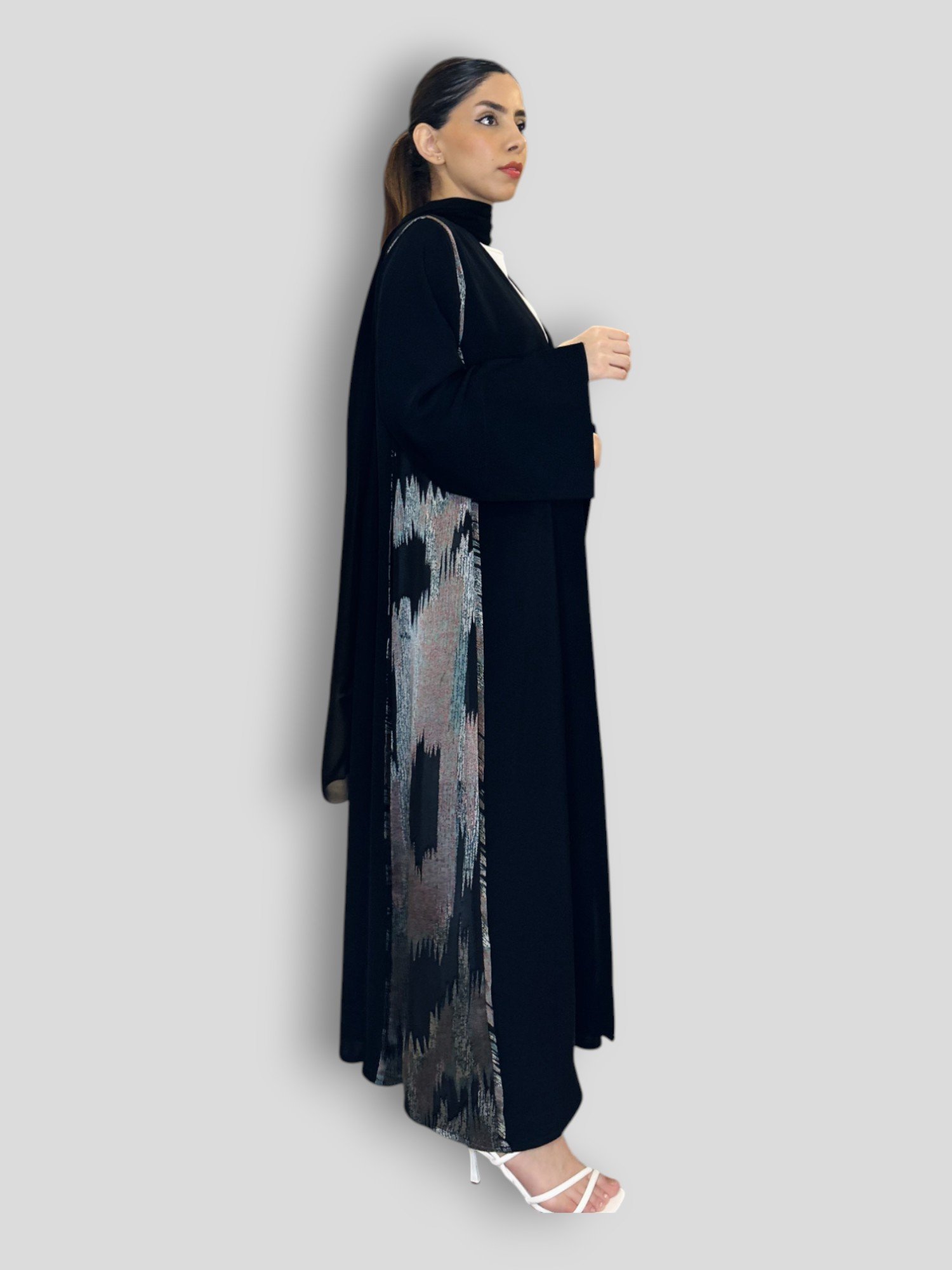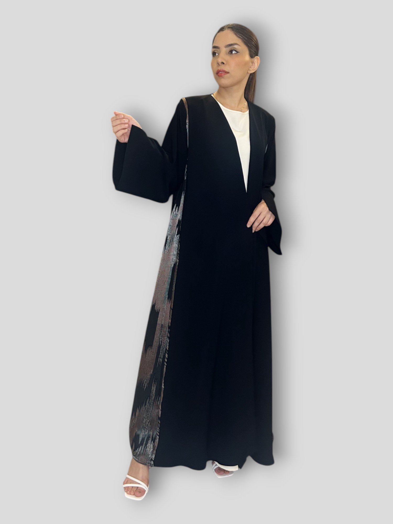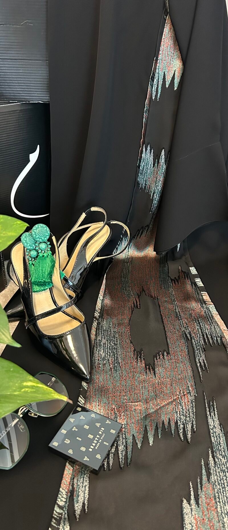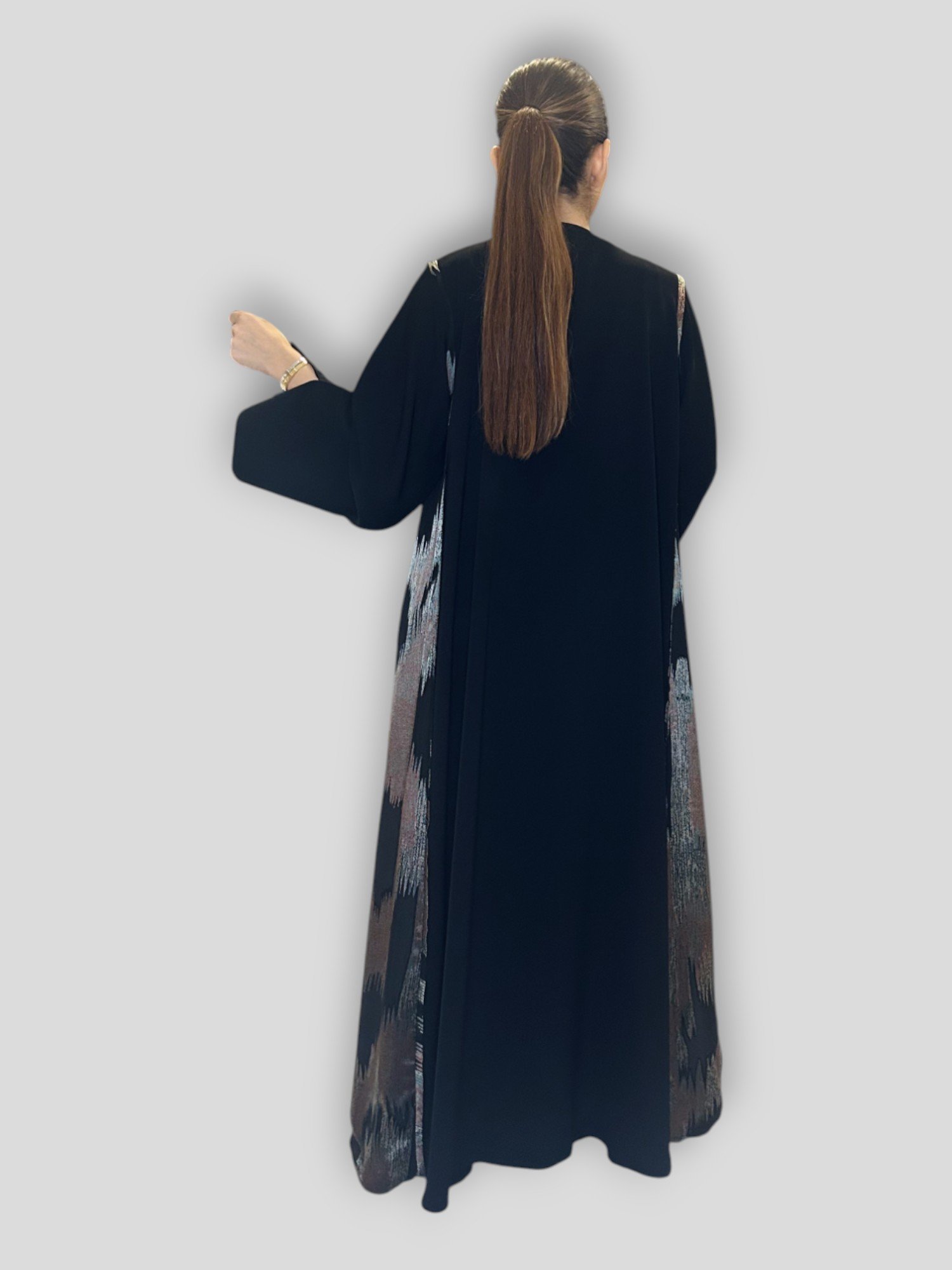 Silver Lining is a kloosh abaya crafted from premium Super Nida in jet black, featuring a flowing silver panel that adds soft shimmer and graceful movement.